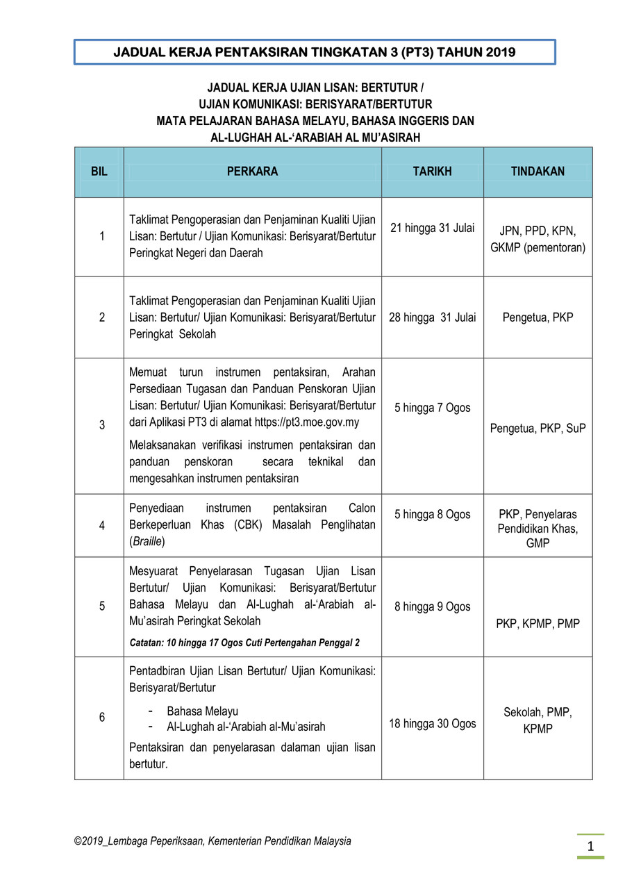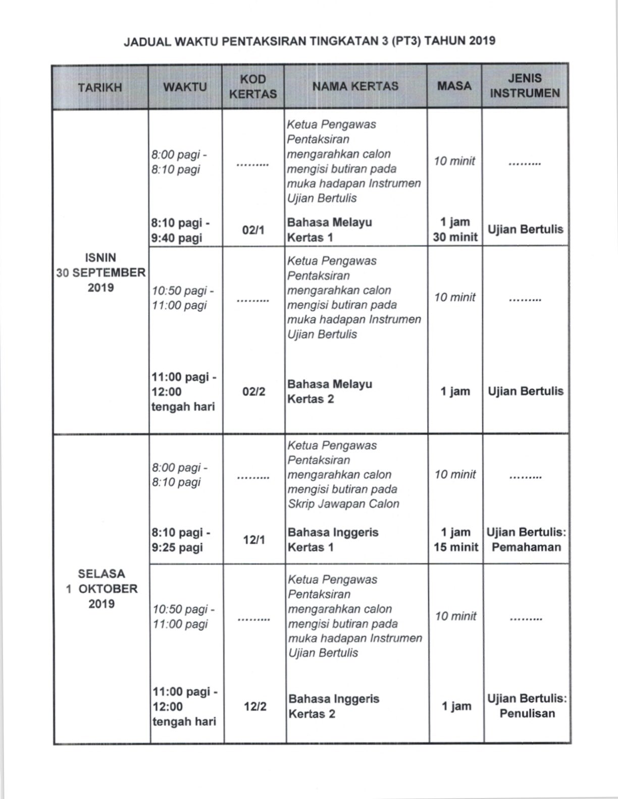 Jadual Waktu Peperiksaan Pt3 2019 Pendidikan Malaysia